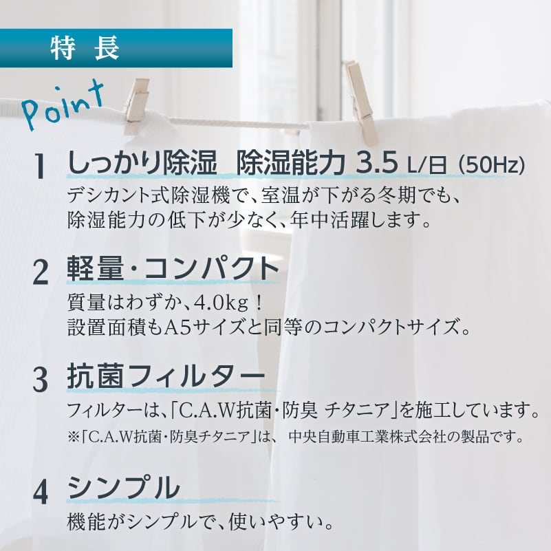 ●環境負荷に配慮したノンフロンタイプのデシカント式で年中活躍。除湿能力3.5L/日(50Hz)でしっかり除湿。衣類やお部屋の湿気をしっかりと取り除きます。