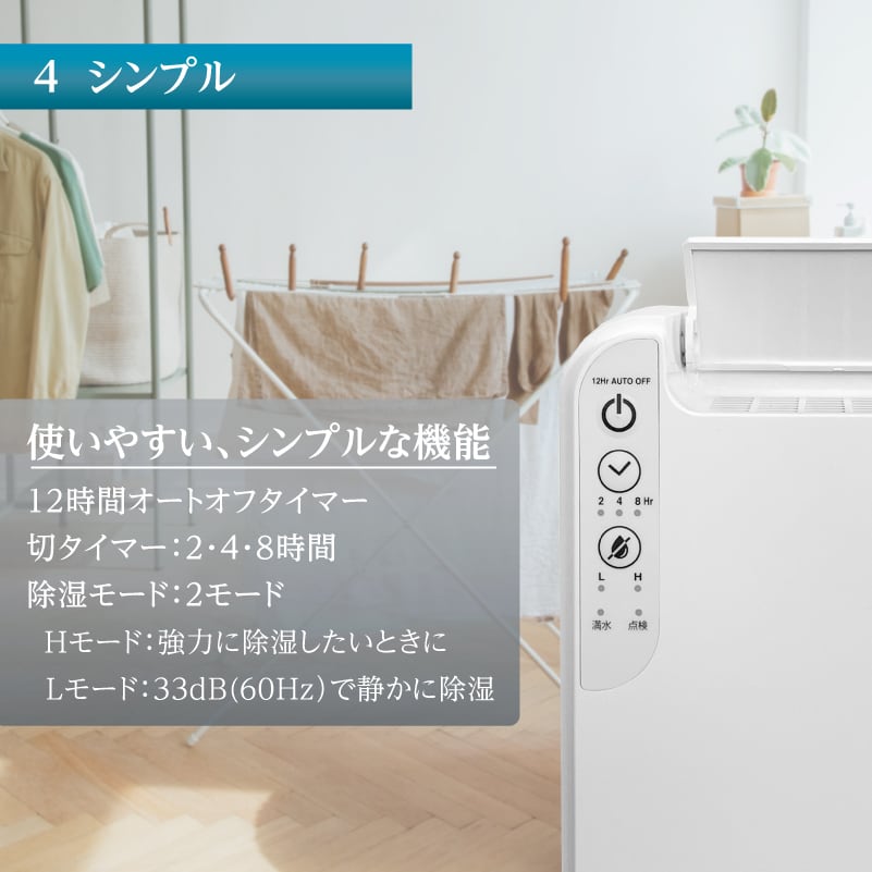 本商品は、デシカント式の除湿技術を採用しており、湿気を効率的に取り除くことで、衣類がしっかりと乾くサポートをします。さらに、抗菌フィルターも搭載されており、安心して清潔にご使用いただけます。